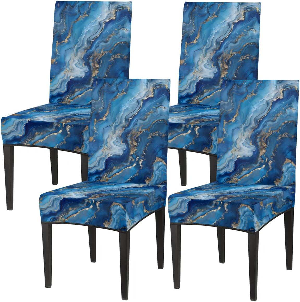 Seat covers for kitchen chairs printed with classic Blue Liquid Marble elements, adding more fun to themed festivals party and kitchen dining daily life. Stretch universal chair covers renew old furniture to fit evolving style, perfect suitable for most furniture styles. Material: Polyester Spandex Fabric Suitable for Chair Size Backrest Height: 17.7-23.6 inches (45-60 cm) Seat Length: 15.7-19.7 inches (40-50 cm) Seat Width: 15-19.7 inches (40-50 cm) Seat Thickness:1.5-4 inches (4-10cm) Package: 2 X Armless Wingback Chair Cover High Stretchy Chair covers for dining room has smooth touch, dustproof, reliable and long lasting. Spandex chair slipcover designed with the anti-slip elastic band, elastic material recovers quickly, secure dining chair slipcovers more fixed. Excellent Protection Stretch chair slipcover extends life of chairs, can protect chair seat cushion for new. Stretchable chair cover will give interior decoration a new look, add flair to home decor, perfect for refurbishing old dining chairs. Ideal Decor Gift Dining room chair cover is sufficient quantity can meet your use and replacement needs, you can use parson chair slipcover to decor meeting, living room, bedroom, conferences, shopping malls. Kitchen chair covers are great gift for family, friend, coworker, neighbor. Easy to Clean Machine washed in mild circulation and cold water. Hand washing is best. Lay chair slipcover flat to dry. Stays the same and as new after every wash. Note Please take measurements before ordering.